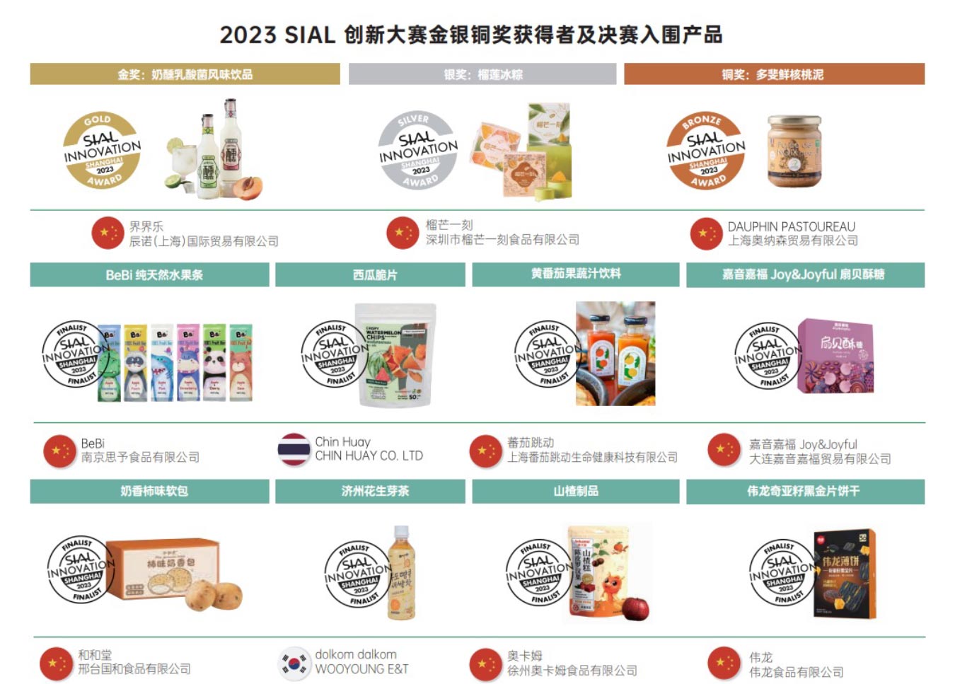 在 2023 SIAL西雅展創(chuàng)新大賽(上海站)的評(píng)選活動(dòng)中,累計(jì)收到全球參賽產(chǎn)品共計(jì)600余款,118款創(chuàng)新產(chǎn)品獲得入圍,所有入圍產(chǎn)品已在2023 SIAL 西雅展(上海)創(chuàng)新大賽展區(qū)展示。其中,榮獲金銀銅大獎(jiǎng)的3款產(chǎn)品和11款決賽入圍產(chǎn)品在2023SIAL西雅展(上海)開(kāi)展首日正式發(fā)布,榮獲金銀銅獎(jiǎng)項(xiàng)的產(chǎn)品更將在 SIAL Network 全球12站巡回展出,共享全球創(chuàng)新趨勢(shì)。