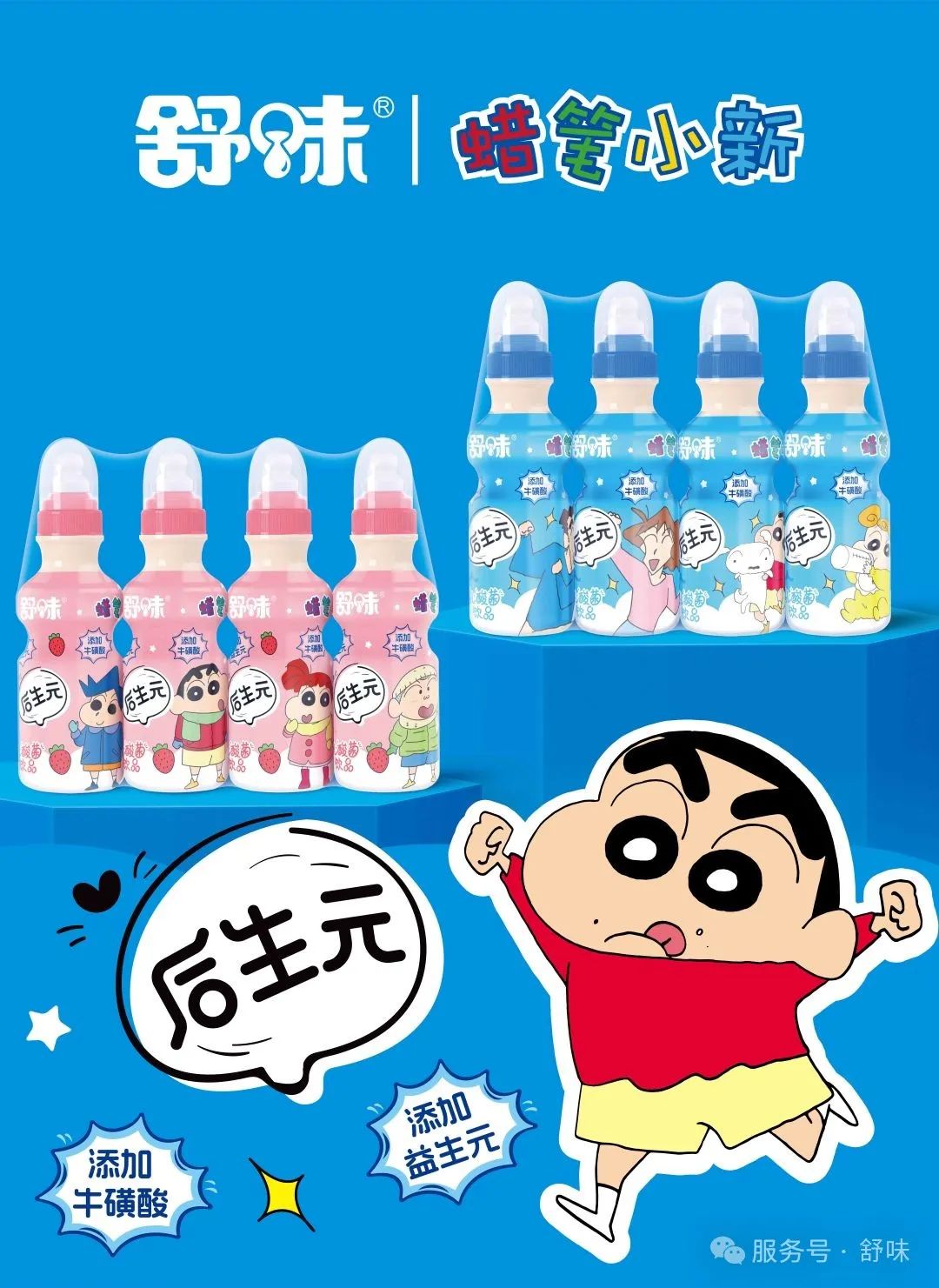 產品亮點:聯(lián)合活潑可愛的蠟筆小新形象推出的舒味乳酸菌,添加?;撬?、益生元,自然發(fā)酵,純正好味,0脂健康,適合朋友小聚時來一瓶。