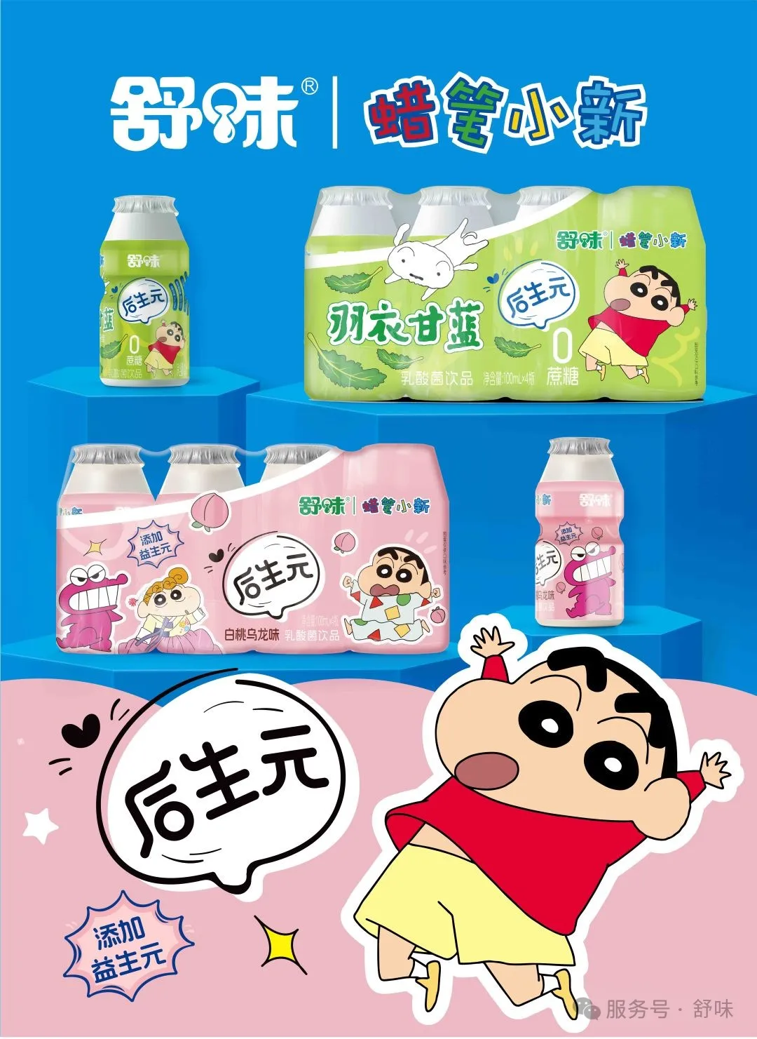 產品:主打蠟筆小新舒味AD鈣、后生元系列乳酸菌以及金銀花柚子汁等產品。