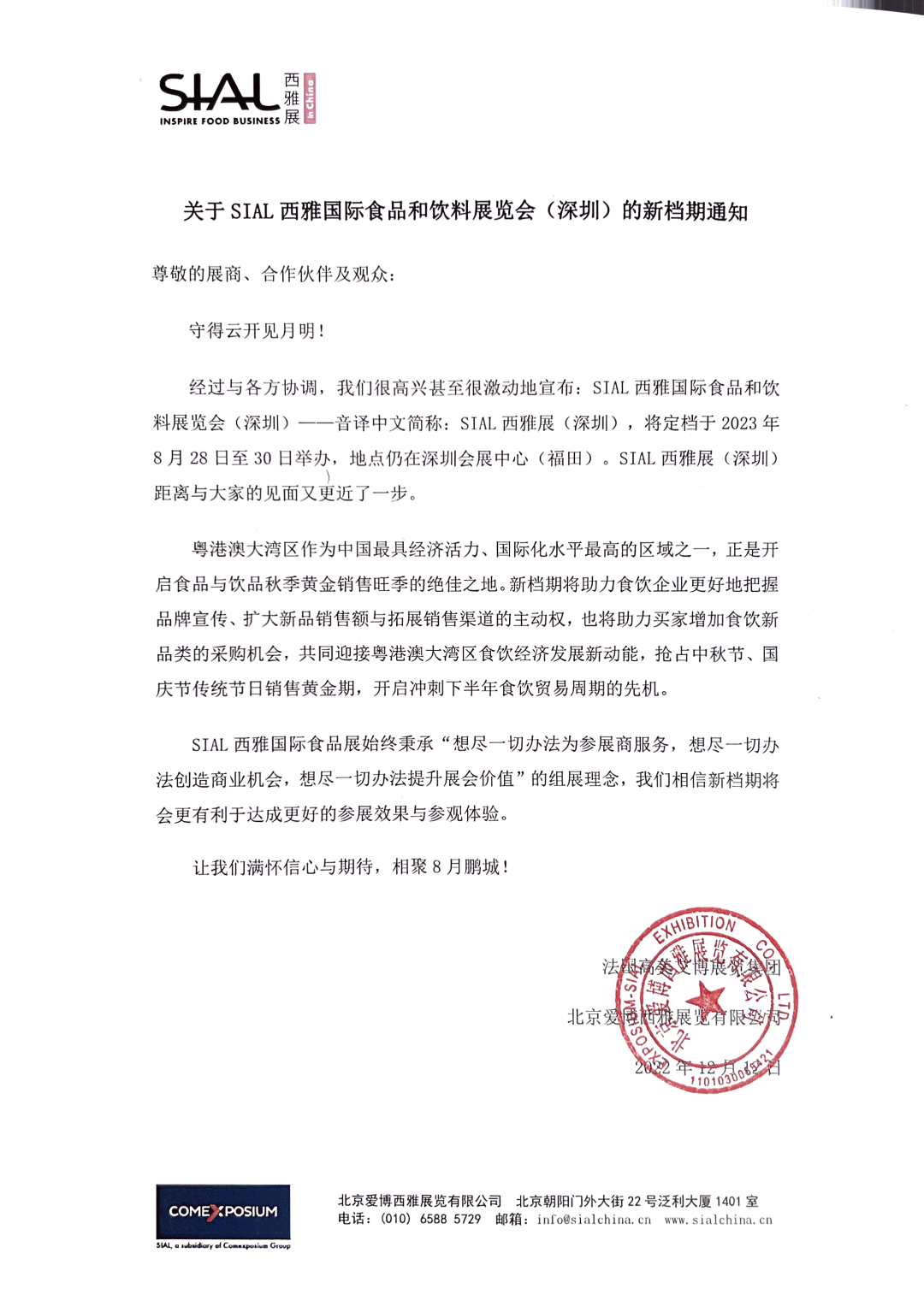 經(jīng)過(guò)與各方協(xié)調(diào),我們很高興甚至很激動(dòng)地宣布:SIAL西雅國(guó)際食品和飲料展覽會(huì)(深圳)——音譯中文簡(jiǎn)稱:SIAL西雅展(深圳),將定檔于2023年8月28日至30日舉辦,地點(diǎn)仍在深圳會(huì)展中心(福田)。SIAL西雅展(深圳)距離與大家的見(jiàn)面又更近了一步。