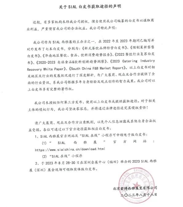 2、于2023年8月28-30日在深圳會展中心(福田)舉辦的2023 SIAL西雅展(深圳)展會現(xiàn)場可領取實體版白皮書。