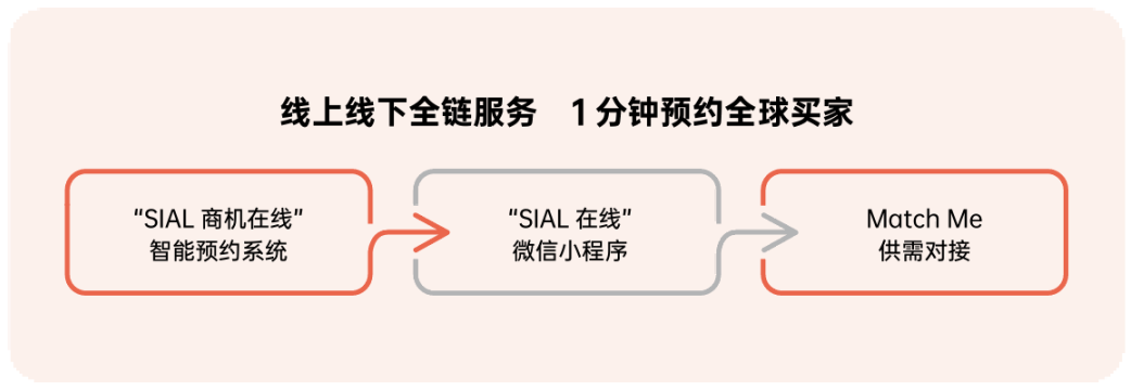 SIAL 西雅展通過一系列精準高效的商貿服務,幫助展商快速找到目標買家,推動業(yè)務快速發(fā)展,如通過SIAL在線小程序全鏈服務,展商只需1分鐘即可預約全球買家,快速建立商貿聯(lián)系。